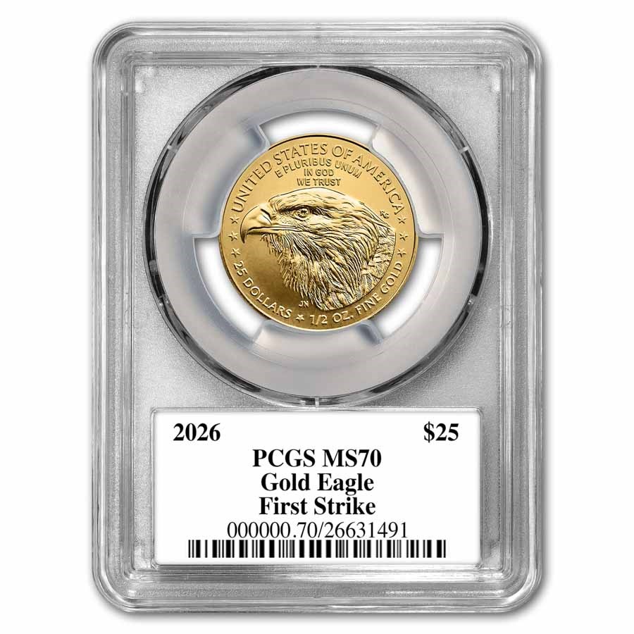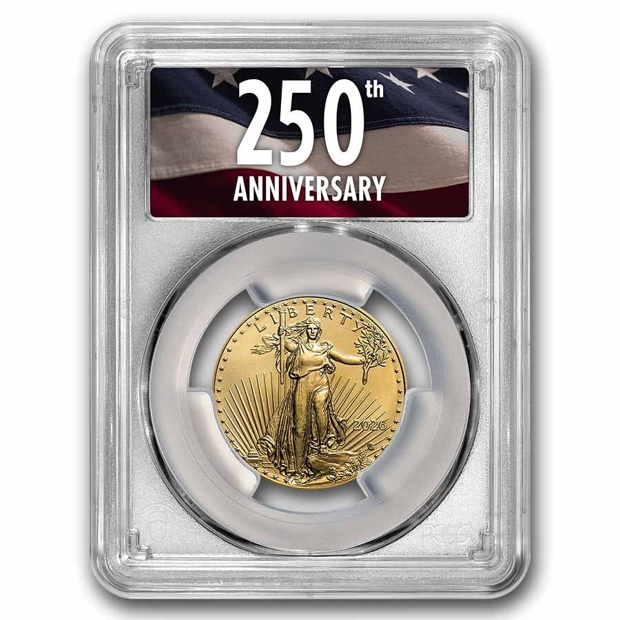 This 2026 1/2 oz American Gold Eagle is graded a perfect MS-70 by the Professional Coin Grading Service. It features a First Strike (FS) designation along with a special 250th Anniversary label, adding enhanced collectible value.